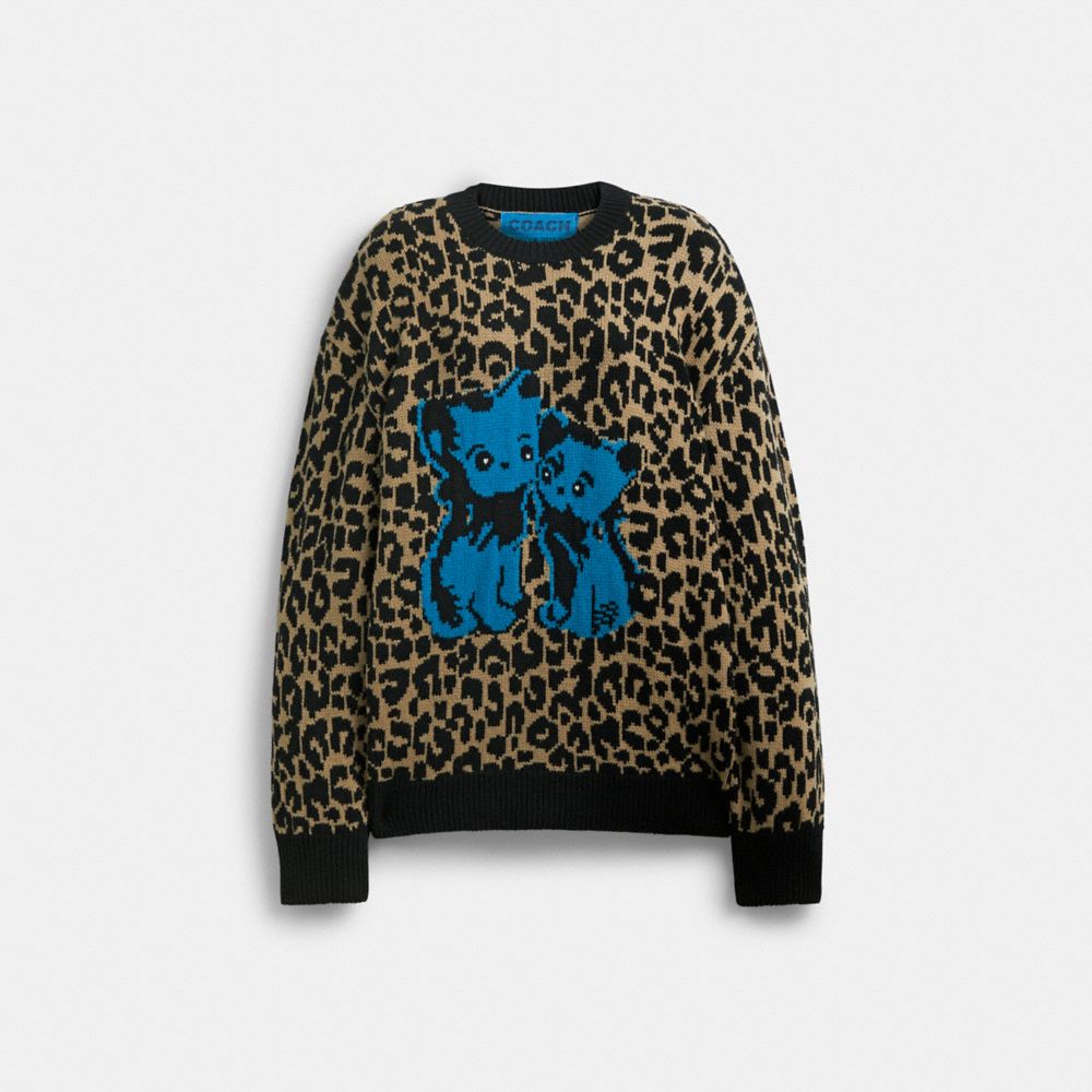 Presenting the Lil Nas X Drop, an edit designed by Coach and curated by Coach Ambassador Lil Nas X, celebrating his unique and expressive approach to style. Knit with a bold leopard pattern inspired by archival 1960s designs of Bonnie Cashin, our first lead designer, this relaxed-fit wool sweater features a graphic inspired by ‘90s underground rave posters and a playful nod to his new pet cats. The cozy crewneck is finished with soft ribbed trim.